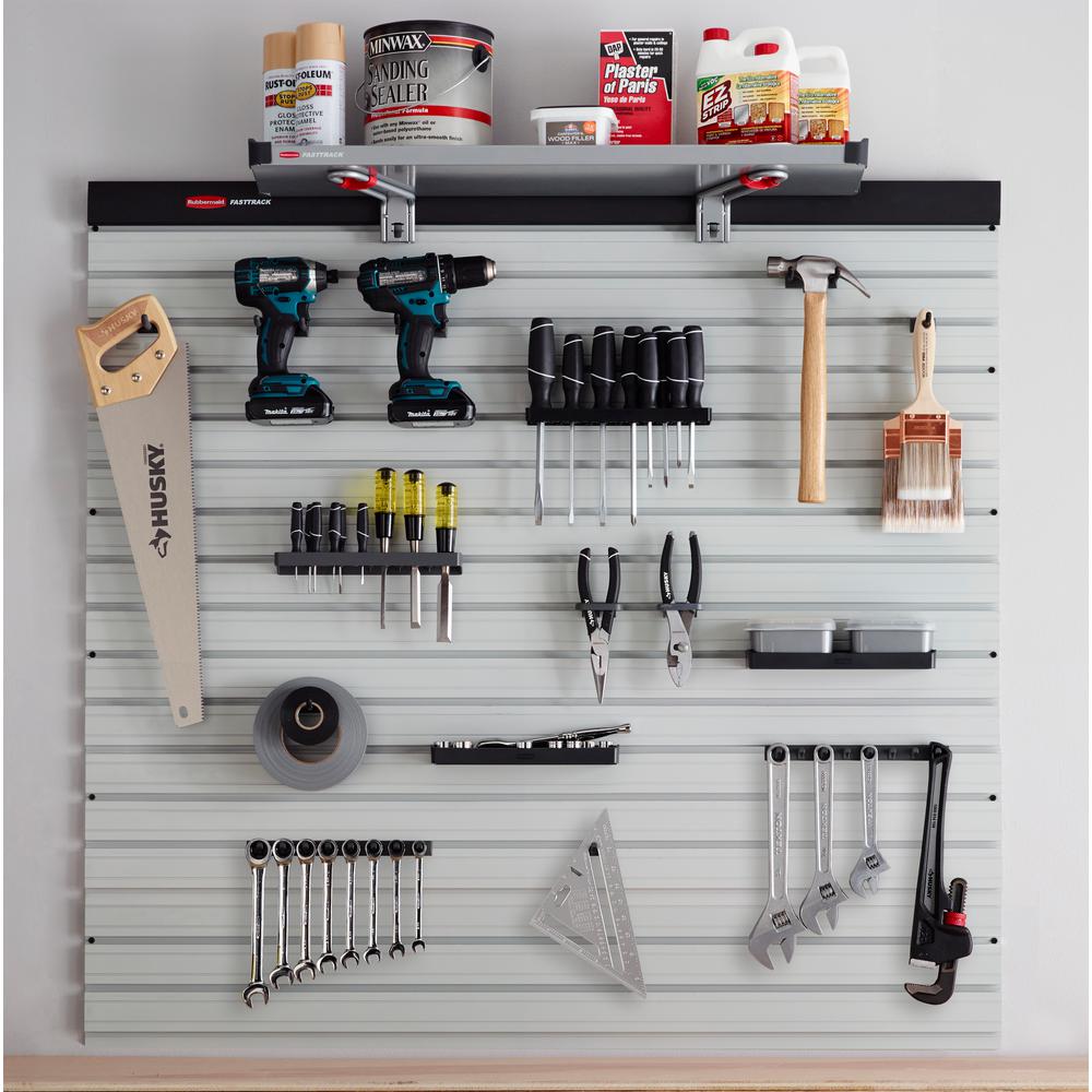 For those who have a work bench or wall for hanging tools, Pegboard and Slat wall are outstanding ways to see your tools. These require installation however the benefits are that everyone knows what tools you have, where to find them and where to return them. Often tools that are family shared are easily stored this way.