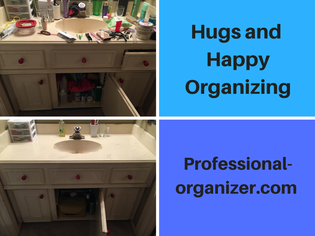 Hugs and happy organizing are client success stories. Here’s a story about a client’s bathroom and bathroom organizing.
