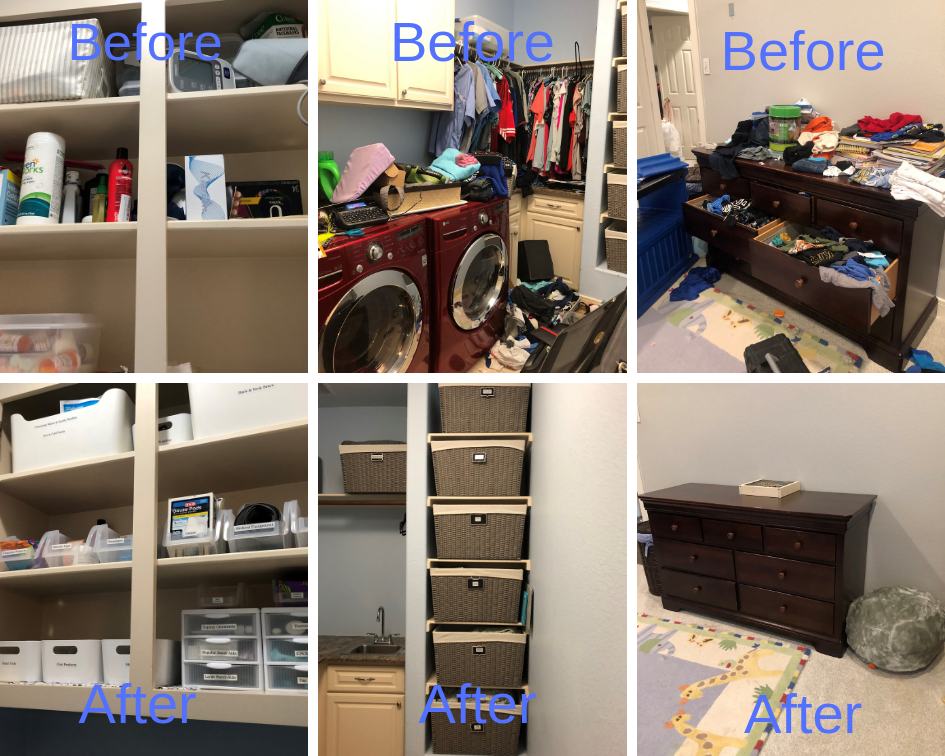 My client and I worked together weekly or every other week to create order in her kitchen, office, son’s room, master bedroom, master closet and master bath. In these photos you can see the significant transformation that occurred each time we met.