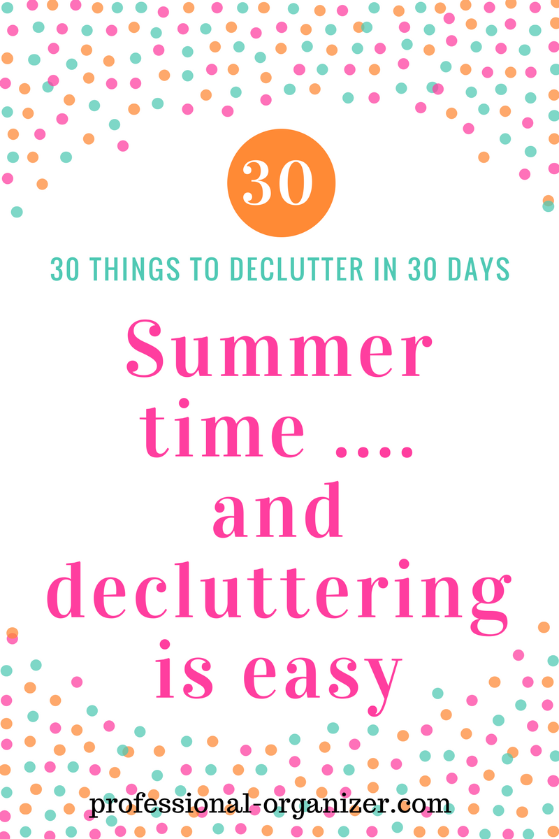 Summer’s here and we have a slower pace.  Summer is typically when we have a little more time, our schedules are a little more flexible.  Hot spots have gathered clutter all year long and now is the time to declutter.  Not only is this a great start,  your summer decluttering efforts will be a gateway to fall. Then it’s on to more serious organizing with back to school and holidays coming up. There are definitely easy items to declutter.  Take advantage of summer to declutter 30 things in 30 days.